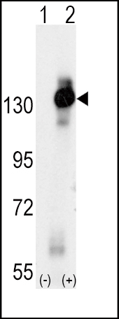 Western blot analysis of CSF1R (arrow) using rabbit polyclonal CSF1R Antibody (C-term)(Cat.APR05949G). 293 cell lysates (2 ug/lane) either nontransfected (Lane 1) or transiently transfected with the CSF1R gene (Lane 2) (Origene Technologies).