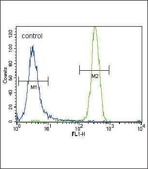 MCSF Receptor (CSF1R) Antibody (C-term) (Cat. APR05949G) flow cytometric analysis of NCI-H460 cells (right histogram) compared to a negative control cell (left histogram).FITC-conjugated goat-anti-rabbit secondary antibodies were used for the analysis. |