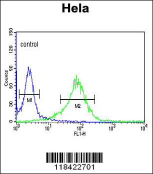 LUM Antibody (N-term) (Cat. APR05951G) flow cytometric analysis of Hela cells (right histogram) compared to a negative control cell (left histogram).FITC-conjugated goat-anti-rabbit secondary antibodies were used for the analysis. |
