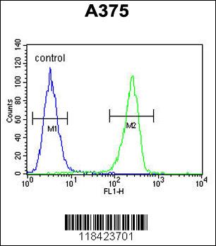 LUM Antibody (Center) (Cat. APR05952G) flow cytometric analysis of A375 cells (right histogram) compared to a negative control cell (left histogram).FITC-conjugated goat-anti-rabbit secondary antibodies were used for the analysis. |