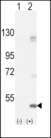 Western blot analysis of FGFR1 (arrow) using rabbit polyclonal FGFR1-pY154 (Cat.APR05973G). 293 cell lysates (2 ug/lane) either nontransfected (Lane 1) or transiently transfected with the FGFR1 gene (Lane 2). |