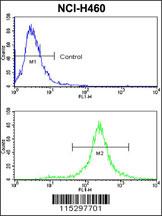 Flow cytometric analysis of NCI-H460 cells using KIT Antibody (N-term D121)(bottom histogram) compared to a negative control cell (top histogram). FITC-conjugated goat-anti-rabbit secondary antibodies were used for the analysis.