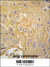 Formalin-fixed and paraffin-embedded human lung carcinoma tissue reacted with MCK10 antibody (Cat.APR05985G), which was peroxidase-conjugated to the secondary antibody, followed by DAB staining. This data demonstrates the use of this antibody for immunohistochemistry; clinical relevance has not been evaluated. |