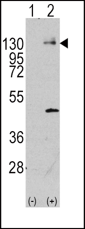 Western blot analysis of PDGFRA (arrow) using rabbit polyclonal PDGFRA Antibody (Y720) (RB11101). 293 cell lysates (2 ug/lane) either nontransfected (Lane 1) or transiently transfected with the PDGFRA gene (Lane 2) (Origene Technologies). |