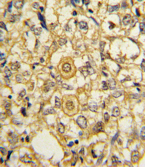 Formalin-fixed and paraffin-embedded human breast carcinoma reacted with PDGFRB Antibody (N-term), which was peroxidase-conjugated to the secondary antibody, followed by DAB staining. This data demonstrates the use of this antibody for immunohistochemistry; clinical relevance has not been evaluated.