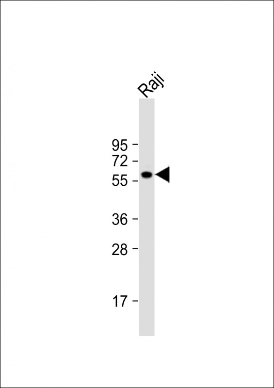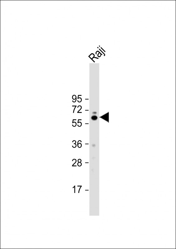 Anti-FGR Antibody (N-term) at 1:1000 dilution + Raji whole cell lysate Lysates/proteins at 20 μg per lane. Secondary Goat Anti-Rabbit IgG, (H+L), Peroxidase conjugated at 1/10000 dilution. Predicted band size : 59 kDa Blocking/Dilution buffer: 5% NFDM/TBST.