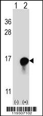 Western blot analysis of FKBP1A (arrow) using rabbit polyclonal FKBP1A Antibody (C-term) (Cat. APR06008G). 293 cell lysates (2 ug/lane) either nontransfected (Lane 1) or transiently transfected (Lane 2) with the FKBP1A gene. |