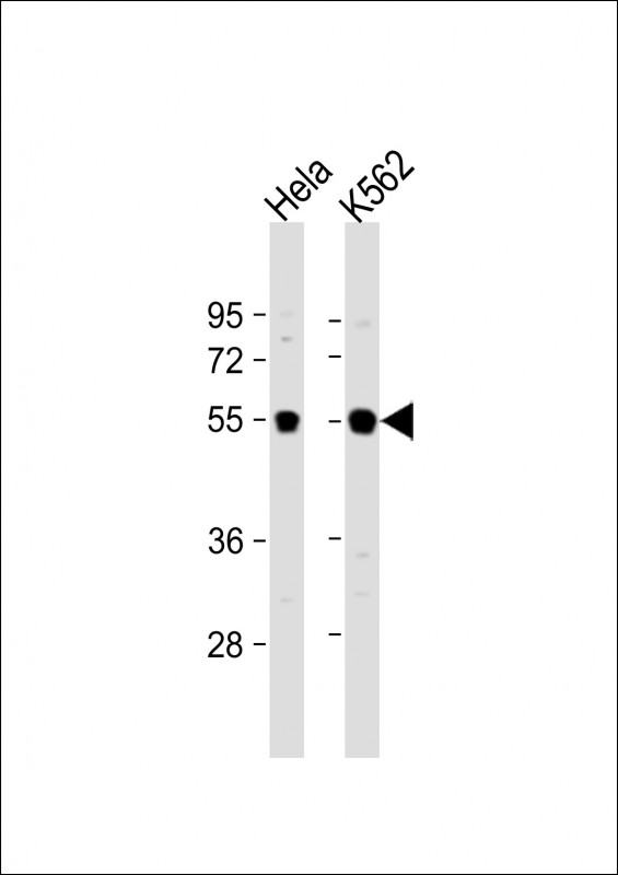 All lanes : Anti-IRAK4 Antibody (N-term) at 1:1000 dilution Lane 1: Hela whole cell lysate Lane 2: K562 whole cell lysate Lysates/proteins at 20 μg per lane. Secondary Goat Anti-Rabbit IgG, (H+L), Peroxidase conjugated at 1/10000 dilution. Predicted band size : 52 kDa Blocking/Dilution buffer: 5% NFDM/TBST.