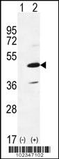 Western blot analysis of IRAK4 (arrow) using rabbit polyclonal IRAK4 Antibody (R20) (Cat. APR06014G). 293 cell lysates (2 ug/lane) either nontransfected (Lane 1) or transiently transfected (Lane 2) with the IRAK4 gene. |