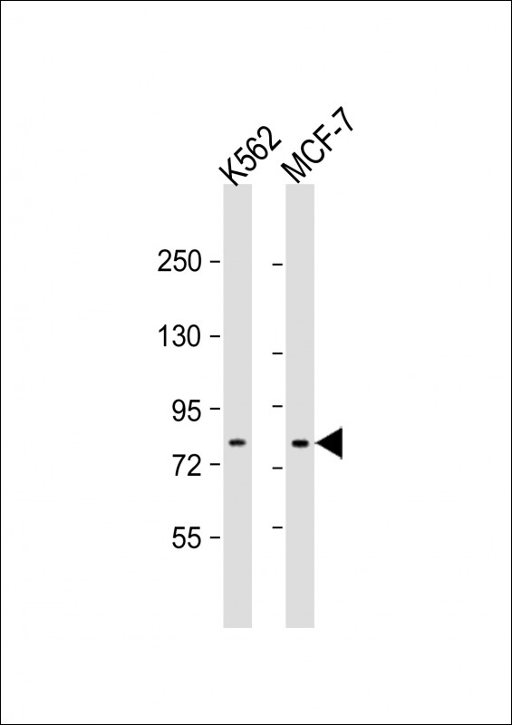 All lanes : Anti-BRAFAntibody at 1:1000 dilution Lane 1: K562 whole cell lysate Lane 2: MCF-7 whole cell lysate Lysates/proteins at 20 μg per lane. Secondary Goat Anti-Rabbit IgG, (H+L), Peroxidase conjugated at 1/10000 dilution. Predicted band size : 84 kDa Blocking/Dilution buffer: 5% NFDM/TBST.