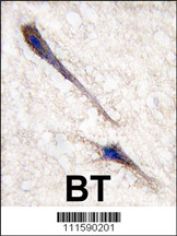 Formalin-fixed and paraffin-embedded human brain tissue reacted with BRAF Antibody (T598) (Cat.APR06015G), which was peroxidase-conjugated to the secondary antibody, followed by DAB staining. This data demonstrates the use of this antibody for immunohistochemistry; clinical relevance has not been evaluated. |