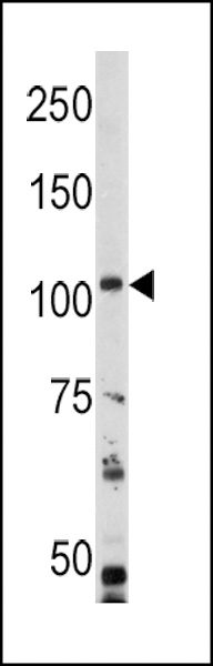 Western blot analysis of anti-PK3CA Antibody (Y317) (Cat.APR06019G) in mouse heart tissue lysates (35ug/lane). PK3CA (arrow) was detected using the purified Pab.