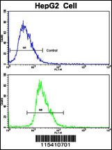 Flow cytometric analysis of HepG2 cells using PK3CA Antibody (Y317)(bottom histogram) compared to a negative control cell (top histogram). FITC-conjugated goat-anti-rabbit secondary antibodies were used for the analysis. |