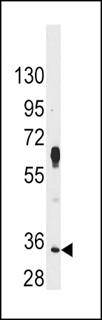 Western blot analysis of anti-PIM2 Antibody (C-term) (Cat.APR06037G) in Hela cell line lysates (35ug/lane). PIM2 (arrow) was detected using the purified Pab.