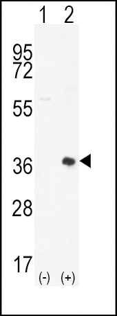 Western blot analysis of PIM2 (arrow) using rabbit polyclonal PIM2 Antibody (D292) (Cat.APR06037G). 293 cell lysates (2 ug/lane) either nontransfected (Lane 1) or transiently transfected (Lane 2) with the PIM2 gene. |