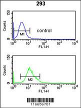 CYP3A43 Antibody (Center) (Cat. APR06048G) flow cytometry analysis of 293 cells (bottom histogram) compared to a negative control cell (top histogram).FITC-conjugated goat-anti-rabbit secondary antibodies were used for the analysis.