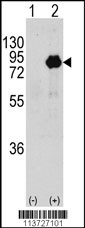 Western blot analysis of PIK3R2 (arrow) using rabbit polyclonal PIK3R2 Antibody (T447) (RB13726). 293 cell lysates (2 ug/lane) either nontransfected (Lane 1) or transiently transfected with the PIK3R2 gene (Lane 2) (Origene Technologies). |
