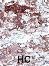Formalin-fixed and paraffin-embedded human cancer tissue reacted with the primary antibody, which was peroxidase-conjugated to the secondary antibody, followed by DAB staining. This data demonstrates the use of this antibody for immunohistochemistry; clinical relevance has not been evaluated. BC = breast carcinoma; HC = hepatocarcinoma. |
