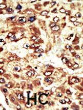 Formalin-fixed and paraffin-embedded human cancer tissue reacted with the primary antibody, which was peroxidase-conjugated to the secondary antibody, followed by AEC staining. This data demonstrates the use of this antibody for immunohistochemistry; clinical relevance has not been evaluated. BC = breast carcinoma; HC = hepatocarcinoma. |