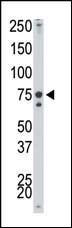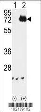 Western blot analysis of IKKalpha (arrow) using rabbit polyclonal IKKalpha Antibody (Cat.APR06070G). 293 cell lysates (2 ug/lane) either nontransfected (Lane 1) or transiently transfected with the IKKalpha gene (Lane 2) (Origene Technologies). |