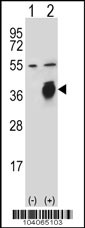 Western blot analysis of PLAUR (arrow) using rabbit polyclonal PLAUR Antibody (W151) (Cat. APR06076G). 293 cell lysates (2 ug/lane) either nontransfected (Lane 1) or transiently transfected (Lane 2) with the PLAUR gene. |