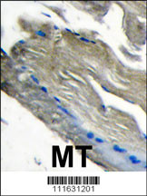 Formalin-fixed and paraffin-embedded human muscle tissue tissue reacted with PI3CKG antibody (C-term)(Cat.AP8180b), which was peroxidase-conjugated to the secondary antibody, followed by DAB staining. This data demonstrates the use of this antibody for immunohistochemistry; clinical relevance has not been evaluated. |