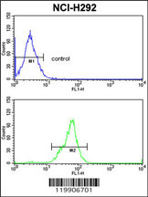 TOB1 Antibody (N-term) (Cat. APR06098G) flow cytometric analysis of NCI-H292 cells (bottom histogram) compared to a negative control cell (top histogram).FITC-conjugated goat-anti-rabbit secondary antibodies were used for the analysis. |