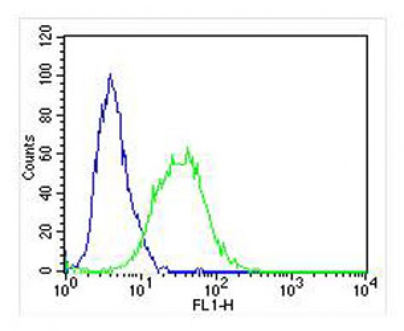 Overlay histogram showing A549 cells stained with APR06104G (green line). The cells were fixed with 2% paraformaldehyde (10 min) and then permeabilized with 90% methanol for 10 min. The cells were then icubated in 2% bovine serum albumin to block non-specific protein-protein interactions followed by the antibody (APR06104G, 1:25 dilution) for 60 min at 37?C. The secondary antibody used was Goat-Anti-Rabbit IgG, DyLight? 488 Conjugated Highly Cross-Adsorbed(NA168821)) at 1/400 dilution for 40 min at 37?C. Isotype control antibody (blue line) was mouse IgG1 (1μg/1x10^6 cells) used under the same conditions. Acquisition of >10, 000 events was performed.
