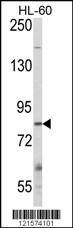 Western blot analysis of CBLB Antibody (Center) (Cat. APR06112G) in HL-60 cell line lysates (35ug/lane). CBLB (arrow) was detected using the purified Pab.