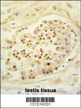 Formalin-fixed and paraffin-embedded human testis tissue reacted with CBLB Antibody (Center), which was peroxidase-conjugated to the secondary antibody, followed by DAB staining. This data demonstrates the use of this antibody for immunohistochemistry; clinical relevance has not been evaluated.