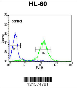 CBLB Antibody (Center) (Cat. APR06112G) flow cytometric analysis of HL-60 cells (right histogram) compared to a negative control cell (left histogram).FITC-conjugated goat-anti-rabbit secondary antibodies were used for the analysis. |
