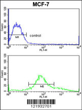 ZYG11A Antibody (N-term) (Cat. APR06113G) flow cytometric analysis of MCF-7 cells (bottom histogram) compared to a negative control cell (top histogram).FITC-conjugated goat-anti-rabbit secondary antibodies were used for the analysis. |