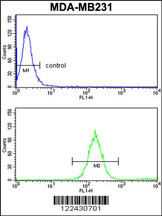 SKIV2L2 Antibody (Center) (Cat.APR06118G) flow cytometry analysis of MDA-MB231 cells (bottom histogram) compared to a negative control cell (top histogram). FITC-conjugated goat-anti-rabbit secondary antibodies were used for the analysis. |