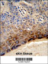 Formalin-fixed and paraffin-embedded human skin tissue reacted with CTHRC1 Antibody (N-term), which was peroxidase-conjugated to the secondary antibody, followed by DAB staining. This data demonstrates the use of this antibody for immunohistochemistry; clinical relevance has not been evaluated.