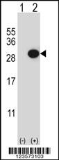 Western blot analysis of CTHRC1 (arrow) using rabbit polyclonal CTHRC1 Antibody (N-term) (Cat. APR06120G). 293 cell lysates (2 ug/lane) either nontransfected (Lane 1) or transiently transfected (Lane 2) with the CTHRC1 gene. |