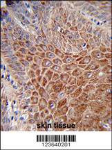 Formalin-fixed and paraffin-embedded human skin reacted with IGH Antibody (C-Term), which was peroxidase-conjugated to the secondary antibody, followed by DAB staining. This data demonstrates the use of this antibody for immunohistochemistry; clinical relevance has not been evaluated. |