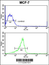 RASL11B Antibody (N-term) (Cat. APR06122G) flow cytometric analysis of MCF-7 cells (bottom histogram) compared to a negative control cell (top histogram).? FITC-conjugated goat-anti-rabbit secondary antibodies were used for the analysis. |