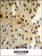 CLIP1 Antibody (N-term) (Cat. APR06132G) IHC analysis in formalin fixed and paraffin embedded mouse brain tissue followed by peroxidase conjugation of the secondary antibody and DAB staining. This data demonstrates the use of the CLIP1 Antibody (N-term) for immunohistochemistry. Clinical relevance has not been evaluated.