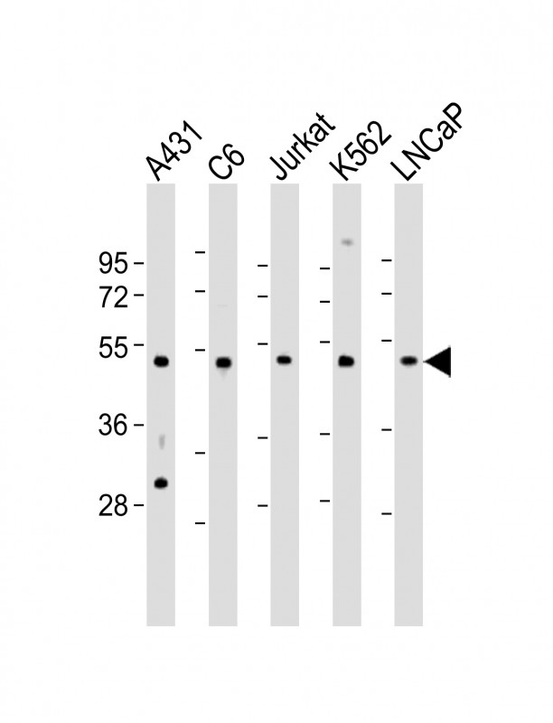 All lanes : Anti-CDC37 Antibody (Center) at 1:2000 dilution Lane 1: A431 whole cell lysate Lane 2: C6 whole cell lysate Lane 3: Jurkat whole cell lysate Lane 4: K562 whole cell lysate Lane 5: LNCaP whole cell lysate Lysates/proteins at 20 μg per lane. Secondary Goat Anti-Rabbit IgG, (H+L), Peroxidase conjugated at 1/10000 dilution. Predicted band size : 44 kDa Blocking/Dilution buffer: 5% NFDM/TBST.