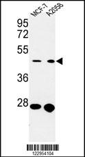 Western blot analysis of CDC37 Antibody (Center) (Cat. APR06133G) in MCF-7, A2058 cell line lysates (35ug/lane). CDC37 (arrow) was detected using the purified Pab.