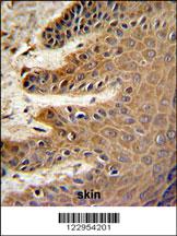 CDC37 Antibody (Center) (Cat. APR06133G) IHC analysis in formalin fixed and paraffin embedded skin followed by peroxidase conjugation of the secondary antibody and DAB staining. This data demonstrates the use of the CDC37 Antibody (Center) for immunohistochemistry. Clinical relevance has not been evaluated. |