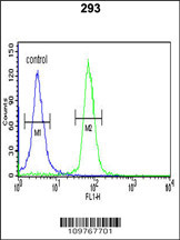 STK40 Antibody ( C-term ) (Cat. APR06136G) flow cytometric analysis of 293 cells (right histogram) compared to a negative control cell (left histogram).FITC-conjugated goat-anti-rabbit secondary antibodies were used for the analysis. |