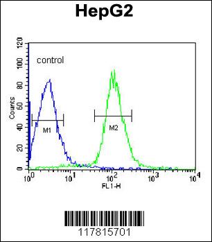 DIPA Antibody (Center) (Cat. APR06144G) flow cytometric analysis of HepG2 cells (right histogram) compared to a negative control cell (left histogram).FITC-conjugated goat-anti-rabbit secondary antibodies were used for the analysis. |