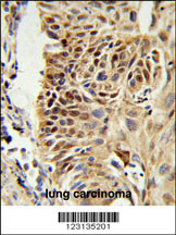CIRBP Antibody (C-term) (Cat. APR06147G) IHC analysis in formalin fixed and paraffin embedded human lung carcinoma followed by peroxidase conjugation of the secondary antibody and DAB staining. This data demonstrates the use of the CIRBP Antibody (C-term) for immunohistochemistry. Clinical relevance has not been evaluated.