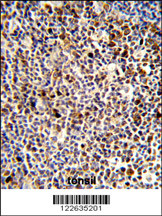 Formalin-fixed and paraffin-embedded human tonsil reacted with KIR3DL3 Antibody (Center), which was peroxidase-conjugated to the secondary antibody, followed by DAB staining. This data demonstrates the use of this antibody for immunohistochemistry; clinical relevance has not been evaluated.