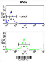 KIR3DL3 Antibody (Center) (Cat. APR06149G) flow cytometry analysis of K562 cells (bottom histogram) compared to a negative control cell (top histogram).FITC-conjugated goat-anti-rabbit secondary antibody was used for the analysis. |