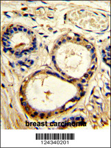 Formalin-fixed and paraffin-embedded human breast carcinoma with SRC8 Antibody (N-term), which was peroxidase-conjugated to the secondary antibody, followed by DAB staining. This data demonstrates the use of this antibody for immunohistochemistry; clinical relevance has not been evaluated. |