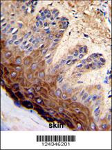 Formalin-fixed and paraffin-embedded human skin with TOP2A Antibody (C-term), which was peroxidase-conjugated to the secondary antibody, followed by DAB staining. This data demonstrates the use of this antibody for immunohistochemistry; clinical relevance has not been evaluated. |