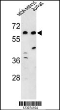 Western blot analysis of C19orf26 Antibody (Center)(Cat. APR06155G) in MDA-MB435, Jurkat cell line lysates (35ug/lane). C19orf26 (arrow) was detected using the purified Pab.