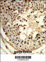 Formalin-fixed and paraffin-embedded human testis tissue reacted with ARGLU1 Antibody (N-term), which was peroxidase-conjugated to the secondary antibody, followed by DAB staining. This data demonstrates the use of this antibody for immunohistochemistry; clinical relevance has not been evaluated.